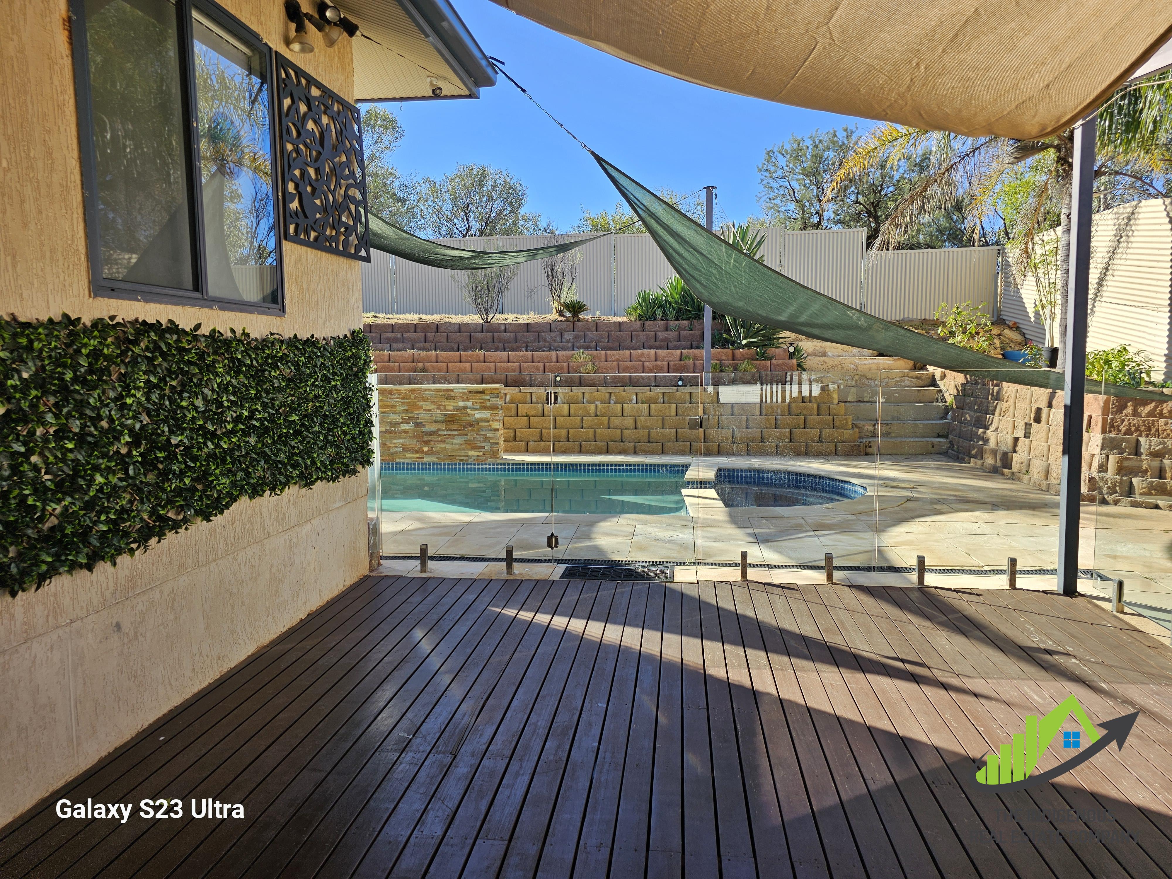 Glass pool fencing, water feature, shaded entertaining area and stunning sandstone pavers surround the saltwater pool and spa area